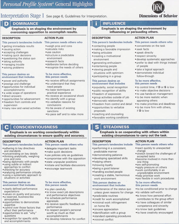 As we look at how the Holy Spirit permeates our human personalities, we need a simple language to use in order to understand ourself and personalities. The DiSC Personal Profile System is my favorite from many good systems. The DiSC is highly compatible with the Myers-Briggs Type Indicator (MBTI). Following is a chart designed to give an overview of the DiSC. Notice the four behavioral styles: